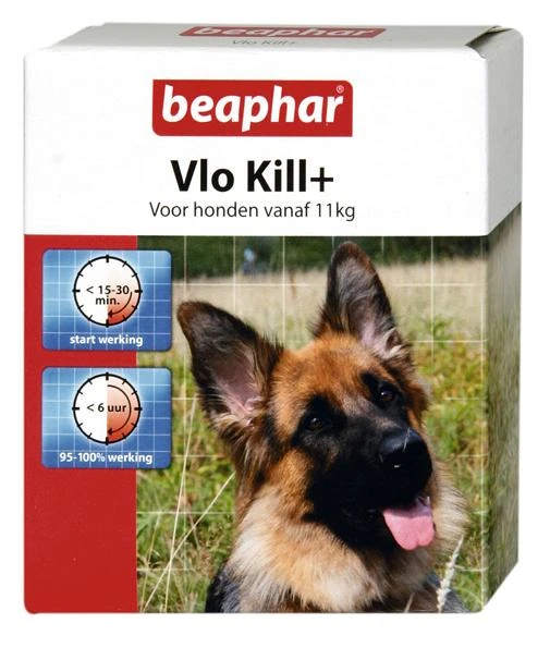 Vlo Kill+ doodt razendsnel vlooien die op de hond zitten, de tablet begint binnen 15 minuten te werken en in 6 uur zijn alle vlooien die op het dier zaten dood. Vlo Kill+ werkt 24 uur en mag daarna herhaald worden. Geschikt voor honden vanaf 4 weken en een een gewicht vanaf 11kg.