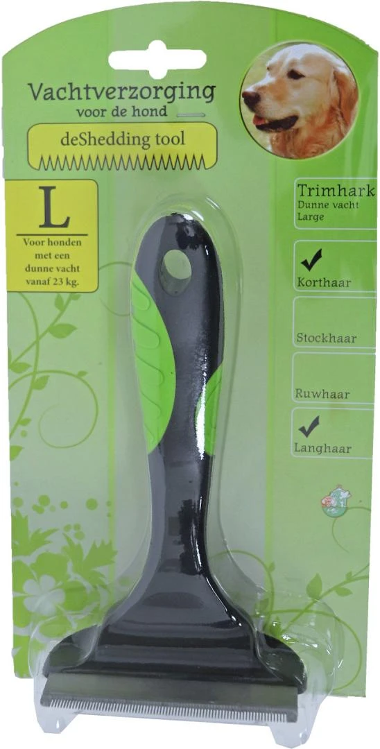 De trimhark dunne vacht large verzorgt de vacht van je hond door middel van het verwijderen van losse en dode haren uit zowel de onder- als de bovenvacht. Deze trimhark is geschikt voor alle kortharige honden met een dunne vacht. Door de ergonomische vorm is deze kam minder belastend voor jouw lichaam. Tevens zorgt de ronde vorm van het mes ervoor dat je juist op alle ronde delen optimaal contact behoudt met de vacht.