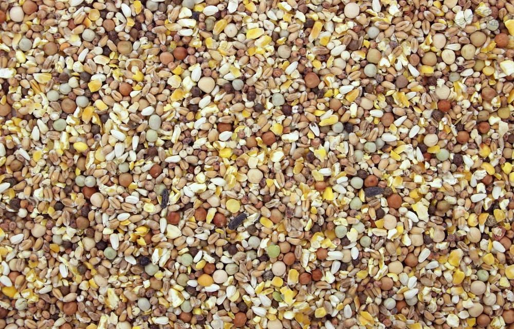 Samenstelling: Tarwe, mais, sorghum, erwten, wikken, kardizaad.