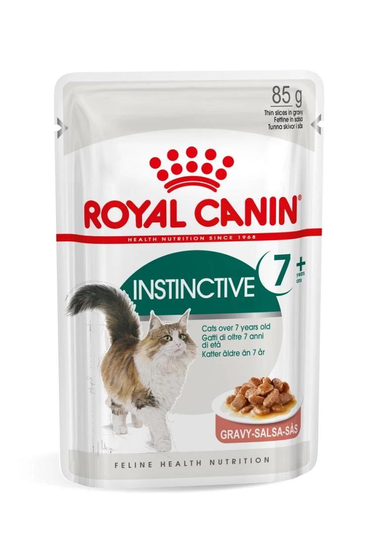Royal Canin Instinctive 7+ in gravy zijn maaltijdzakjes met vleesbrokjes in saus voor katten ouder dan 7 jaar.