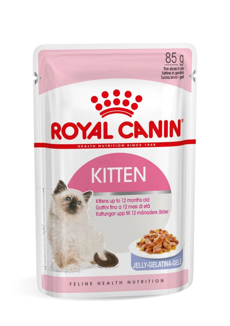 Royal Canin Kitten in jelly zijn maaltijdzakjes met vleesbrokjes in gelei voor kittens van 4 tot 12 maanden.